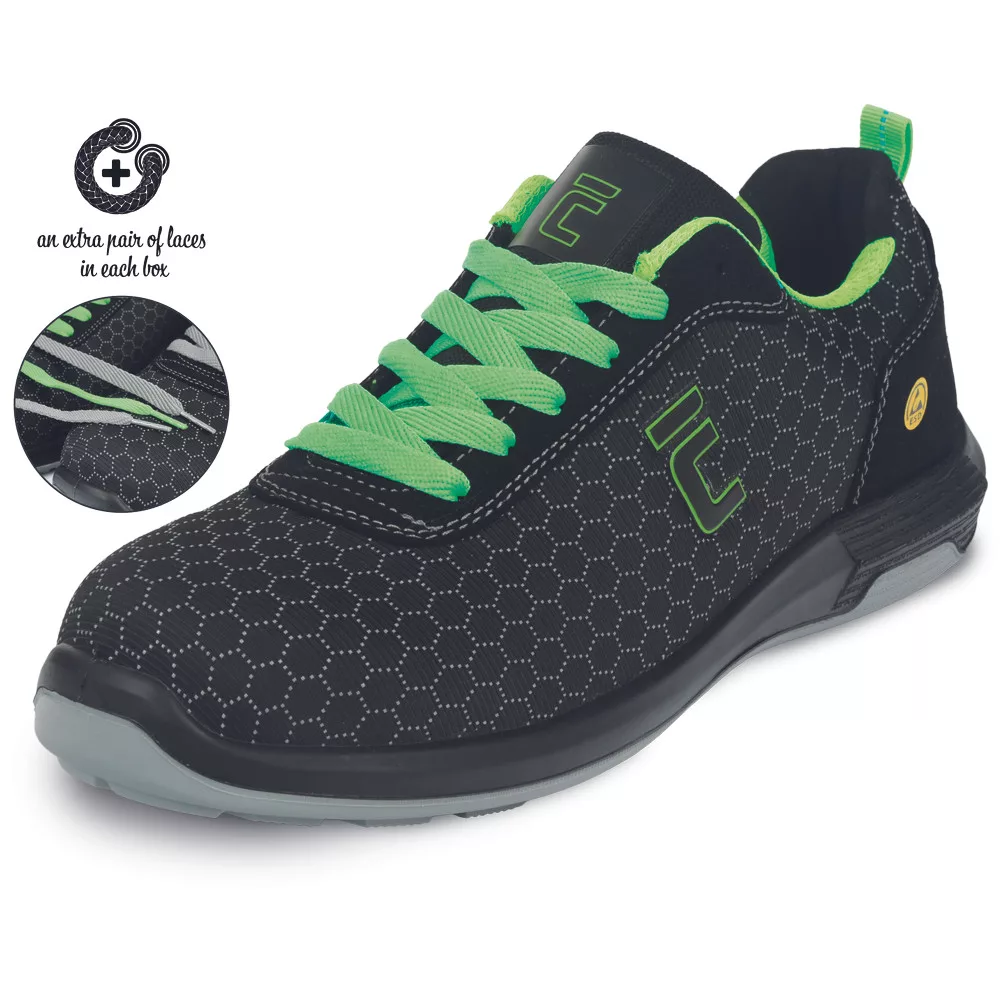 Fémmentes ESD biztonsági félcipő üvegszálas kompozit lábujjvédővel és "S" típusú többrétegű PES átszúrás ellen védő köztalppal.