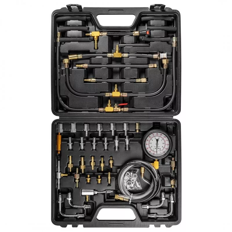 Benzinmotorok befecskendező rendszereinek ellenőrzésére tervezett készlet. A készlet részét képező manométerrel max. 140 PSI/10 bar tartományig végezhető tesztelés. A készletben gyorscsatlakozós és beépített elzárószeleppel rendelkező adapterek vannak. A flexibilis tömlő lehetővé teszi a nehezen hozzáférhető helyeken lévő olajnyomás kapcsolók elérését is. A készlet K - és KE - Jetronic sis, KE - Jetronic kic, L - Jetronic liw befecskendező rendszerek tesztelésére készült. Lehetővé teszi a nyomás mérését a szivattyúkban és a visszatérő nyomás mérését. Műanyag kofferbe csomagolt
