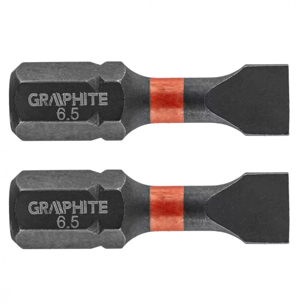 GRAPHITE torziós bit ütvecsavarozáshoz (ref. 56H511) SL6.5x25 mm. Nagy teljesítményu bitek, amelyeket nagy nyomatékú csavarbehajtóval vagy ütvecsavarozóval, történő munkavégzéshez terveztek. Kiváló minőségű S2 acélból készül, amelyet fokozott rugalmasság és a mechanikai sérülésekkel szembeni ellenállás jellemzi. A nagy nyomaték hatására forgó torziós zóna csökkenti az erőátadást, ami ellenállóbbá teszi a töréssel szemben, és élettartama lényegesen hosszabb lesz. A hegy csúcspontja tökéletes illeszkedést garantál.