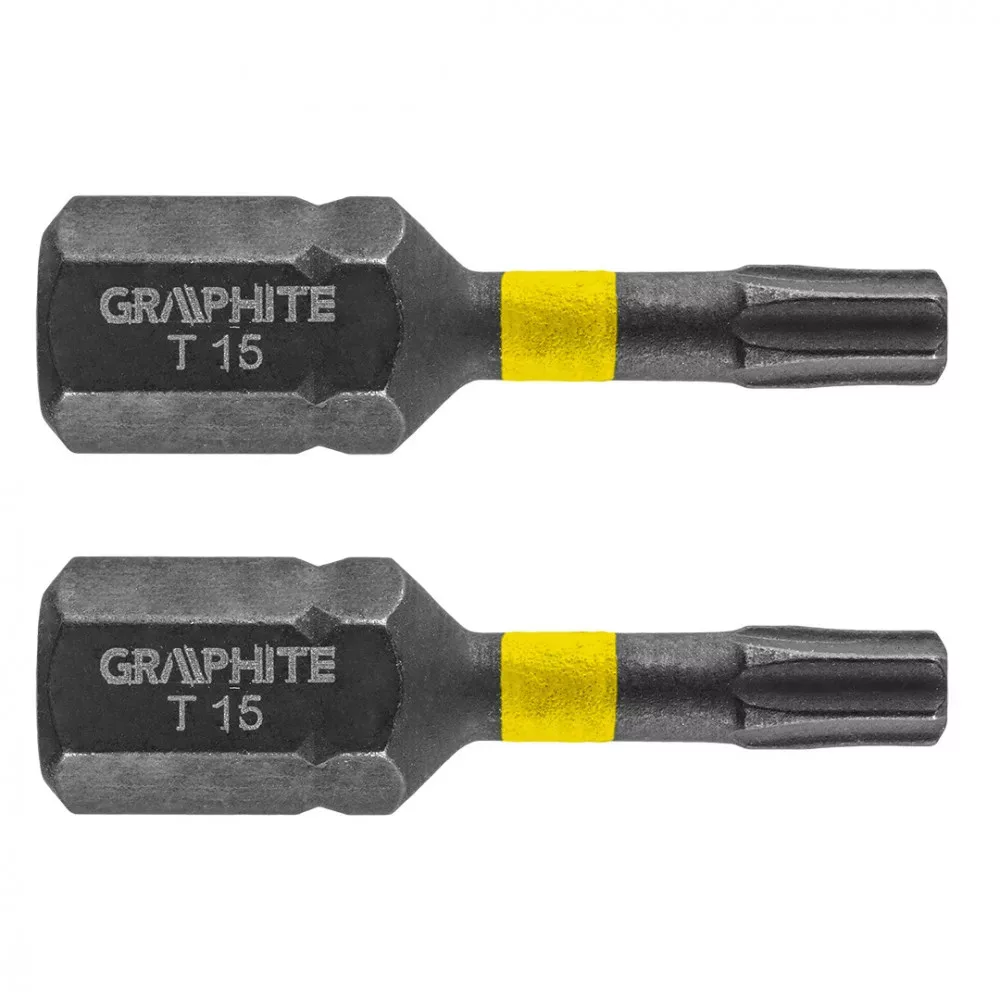GRAPHITE torziós bit ütvecsavarozáshoz (ref. 56H512) TX15x25 mm. Nagy teljesítményu bitek, amelyeket nagy nyomatékú csavarbehajtóval vagy ütvecsavarozóval, történő munkavégzéshez terveztek. Kiváló minőségű S2 acélból készül, amelyet fokozott rugalmasság és a mechanikai sérülésekkel szembeni ellenállás jellemzi. A nagy nyomaték hatására forgó torziós zóna csökkenti az erőátadást, ami ellenállóbbá teszi a töréssel szemben, és élettartama lényegesen hosszabb lesz. A hegy csúcspontja tökéletes illeszkedést garantál.