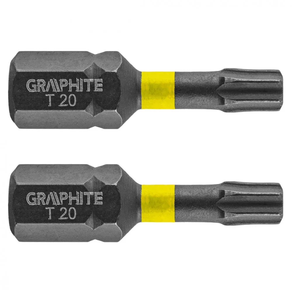 GRAPHITE torziós bit ütvecsavarozáshoz (ref. 56H513) TX20x25 mm. Nagy teljesítményu bitek, amelyeket nagy nyomatékú csavarbehajtóval vagy ütvecsavarozóval, történő munkavégzéshez terveztek. Kiváló minőségű S2 acélból készül, amelyet fokozott rugalmasság és a mechanikai sérülésekkel szembeni ellenállás jellemzi. A nagy nyomaték hatására forgó torziós zóna csökkenti az erőátadást, ami ellenállóbbá teszi a töréssel szemben, és élettartama lényegesen hosszabb lesz. A hegy csúcspontja tökéletes illeszkedést garantál.