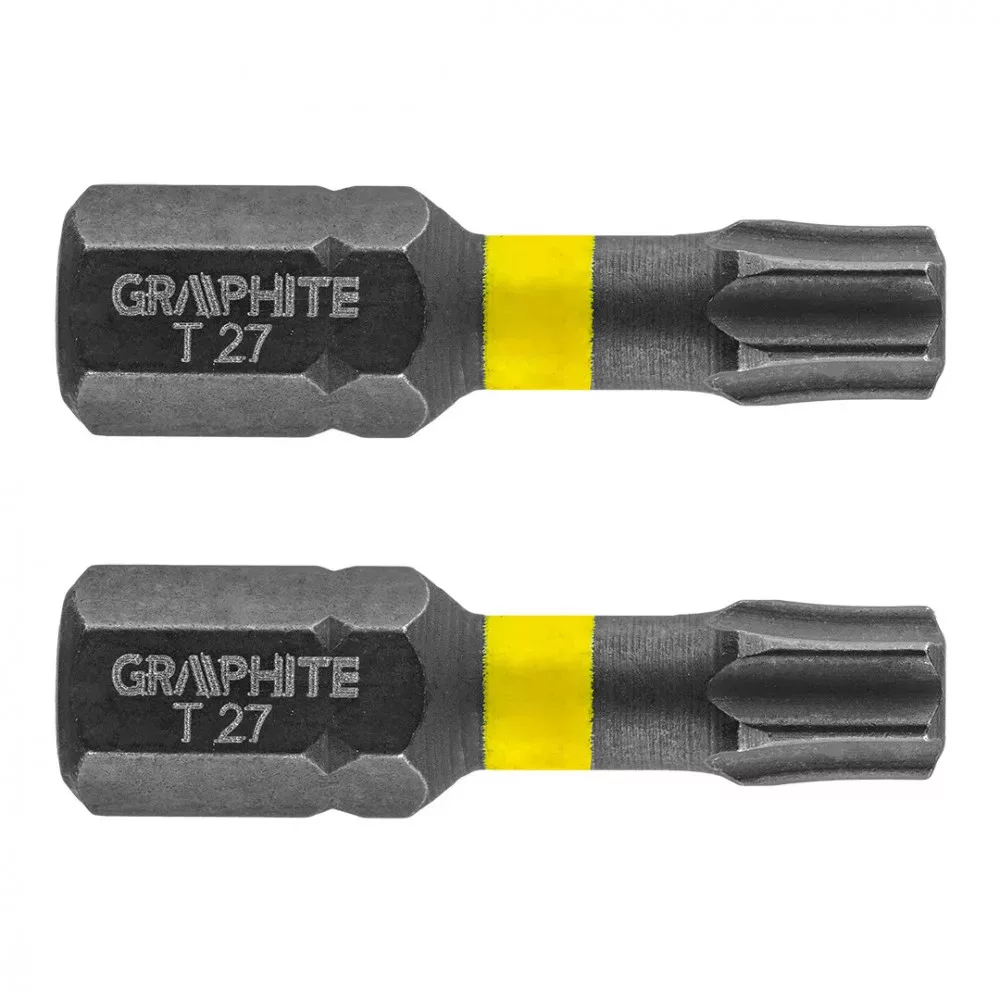 GRAPHITE torziós bit ütvecsavarozáshoz (ref. 56H515) TX27x25 mm. Nagy teljesítményu bitek, amelyeket nagy nyomatékú csavarbehajtóval vagy ütvecsavarozóval, történő munkavégzéshez terveztek. Kiváló minőségű S2 acélból készül, amelyet fokozott rugalmasság és a mechanikai sérülésekkel szembeni ellenállás jellemzi. A nagy nyomaték hatására forgó torziós zóna csökkenti az erőátadást, ami ellenállóbbá teszi a töréssel szemben, és élettartama lényegesen hosszabb lesz. A hegy csúcspontja tökéletes illeszkedést garantál.