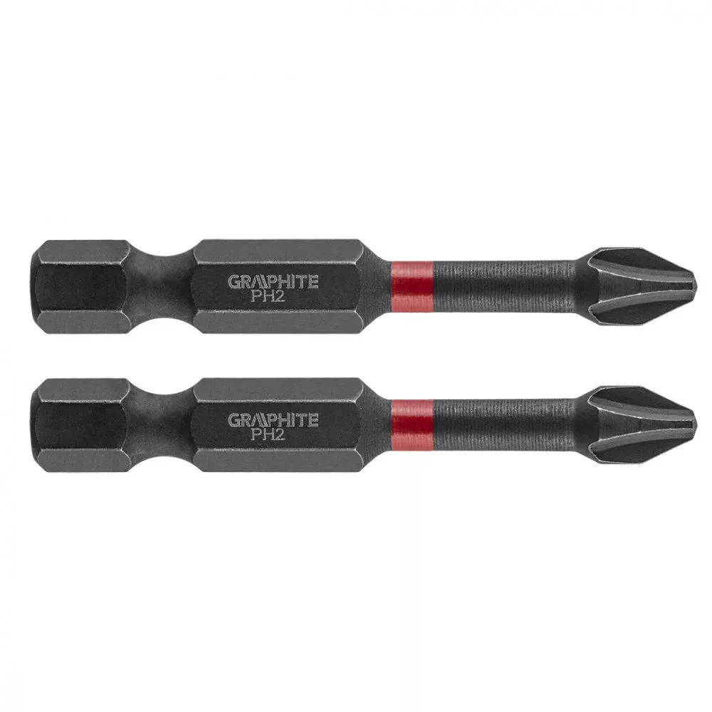 GRAPHITE torziós bit ütvecsavarozáshoz (ref. 56H519) PH2x50 mm. Nagy teljesítményu bitek, amelyeket nagy nyomatékú csavarbehajtóval vagy ütvecsavarozóval, történő munkavégzéshez terveztek. Kiváló minőségű S2 acélból készül, amelyet fokozott rugalmasság és a mechanikai sérülésekkel szembeni ellenállás jellemzi. A nagy nyomaték hatására forgó torziós zóna csökkenti az erőátadást, ami ellenállóbbá teszi a töréssel szemben, és élettartama lényegesen hosszabb lesz. A hegy csúcspontja tökéletes illeszkedést garantál.