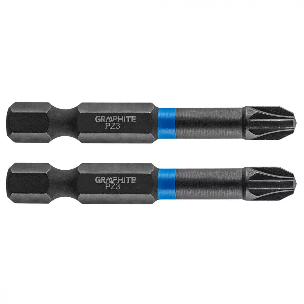 GRAPHITE torziós bit ütvecsavarozáshoz (ref. 56H523) PZ3x50 mm. Nagy teljesítményu bitek, amelyeket nagy nyomatékú csavarbehajtóval vagy ütvecsavarozóval, történő munkavégzéshez terveztek. Kiváló minőségű S2 acélból készül, amelyet fokozott rugalmasság és a mechanikai sérülésekkel szembeni ellenállás jellemzi. A nagy nyomaték hatására forgó torziós zóna csökkenti az erőátadást, ami ellenállóbbá teszi a töréssel szemben, és élettartama lényegesen hosszabb lesz. A hegy csúcspontja tökéletes illeszkedést garantál.
