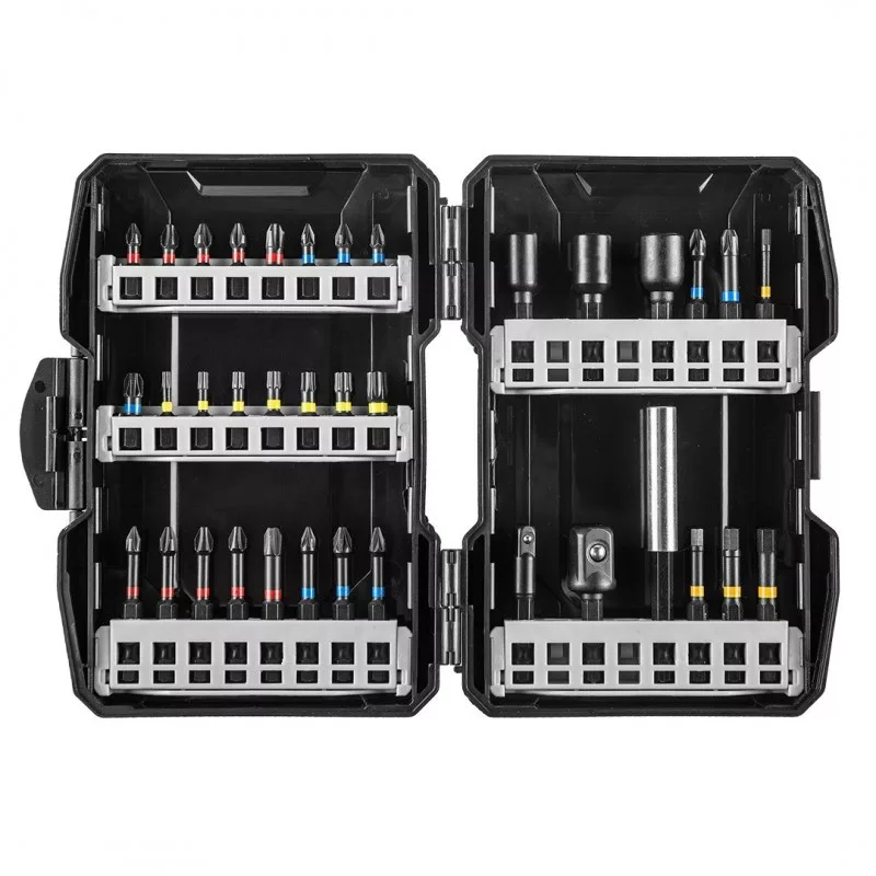 GRAPHITE torziós bitkészlet (ref. 56H560) 36 db-os. 16 bites PH1/2/2/2/3, PZ1/2/2/3, T10/15/20/25/27/30/40, teljes hossz 25 mm, 14 bit PH1/2/2/2/3, PZ1/2/2/2/3, HEX3/4/5/6, teljes hossza 50 mm. Fogantyú, három foglalat és két adapter. Ezek tartós bitek, amelyeket nagy nyomatékú gépekkel vagy ütvecsavarozókkal történő munkához terveztek. Kiváló minőségű S2 acélból készülnek, amelyet fokozott rugalmasság és a mechanikai sérülésekkel szembeni ellenállás jellemez. A nagy nyomaték hatására a torziós zóna csökkenti a feszültséget ami ellenállóbbá teszi a bitet a töréssel szemben így élettartama lényegesen hosszabb lesz. A hegy csúcspontja tökéletes illeszkedést garantál. Műanyag doboz, gumírozott élekkel.