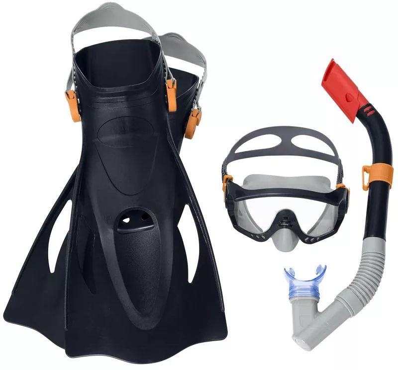 A búvárszemüveg lágy tömítéssel van ellátva, amely kényelmes illeszkedést és megbízható védelmet biztosít a víz behatolása ellen. A tartós polikarbonátból készült lencsék tiszta és széles látóteret biztosítanak a víz alatt. A snorkel könnyű és kényelmes légzést tesz lehetővé úszás közben a felszínen, míg az uszonyok hatékony és gyors mozgást biztosítanak a vízben.