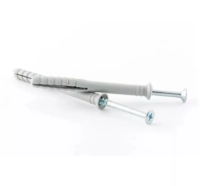 Beütőék műanyag tiplivel, 10x100 egy szétnyíló műanyag dübellel szerelt ékszerű csavar, ami a furatba beüthető és a kötés létre is jön.