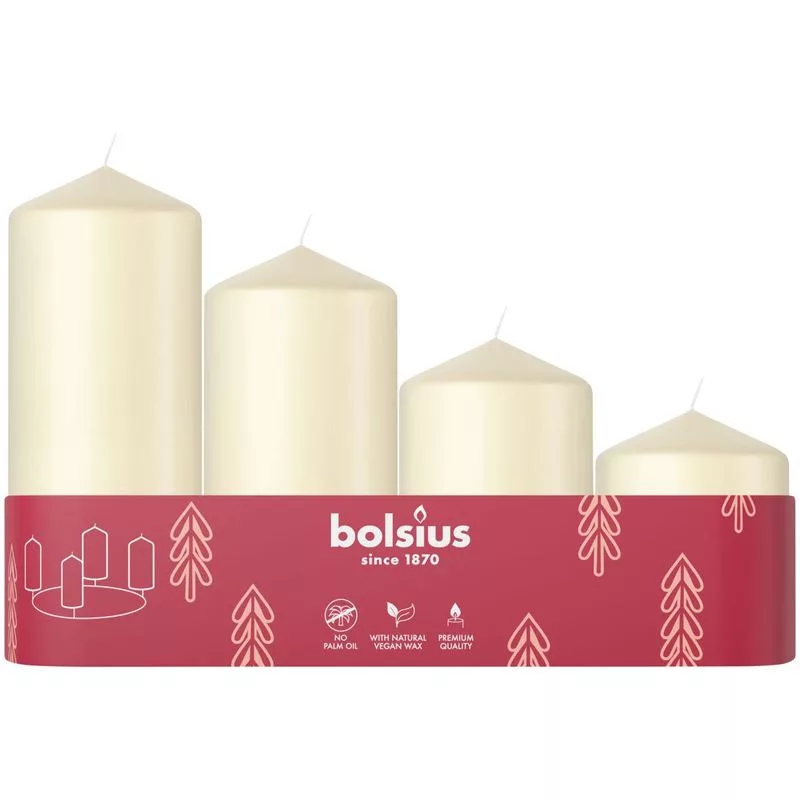 A Bolsius oszlopos adventi gyertyák tökéletes kiegészítői a karácsonyi ünnepi dekorációnak. A készlet 4 darab krémszínű, különböző magasságú (60 mm, 80 mm, 100 mm és 120 mm), 48 mm átmérőjű oszlopgyertyát tartalmaz, amelyek így vonzóan elrendezhetők például egy adventi koszorún.