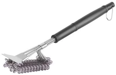 Strend Pro Grill BBQ tisztítókefe a szennyeződések eltávolítására szolgál. A kefén egy fekete műanyag fogantyú található a jobb fogáshoz. Rajta egy cinkbevonatos huzalból készült hengerkefe és egy rozsdamentes acélból készült ételmaradék kaparó található. Nem kell aggódnia a grillrács esetleges károsodása vagy karcolása miatt.