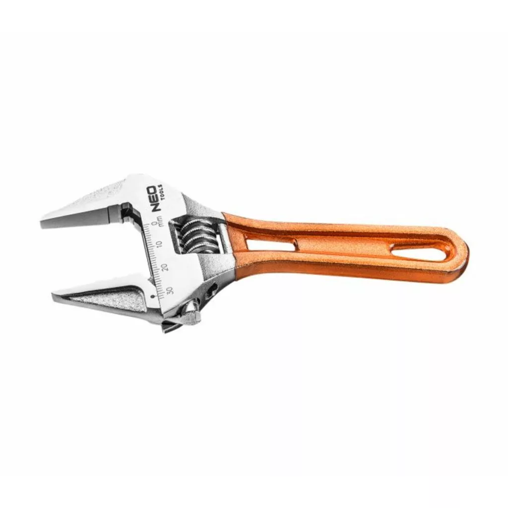 NEO nagyszilárdságú króm-vanádium acélból kovácsolt 118 mm hosszú 0-28 mm terjedelmű csőfogó kulcs. Megkülönböztetik hosszabbított, profilozott, széles terjedelemben szabályozható pofái és a kulcs fejének kis vastagsága, ami megkönnyíti a munkavégzést a nehezen hozzáférhető helyeken. A rövidebb markolat, a szélesebb pofa távolság megőrzésével, lehetővé teszi a kulcs használatát a korlátozott méretű helyeken. A kulcs a kicsavarozott elemek védelmi rendszerével rendelkezik - az erő nem tevődik át közvetlenül a csavar vagy az anyacsavar szélére. A fogantyú speciális kialakítása révén a kulcs 30%-kal könnyebb a hagyományos csőfogó kulcsnál. A csúszásgátló bevonatú markolat garantálja a biztos fogást és biztosítja a biztonságos munkavégzést.