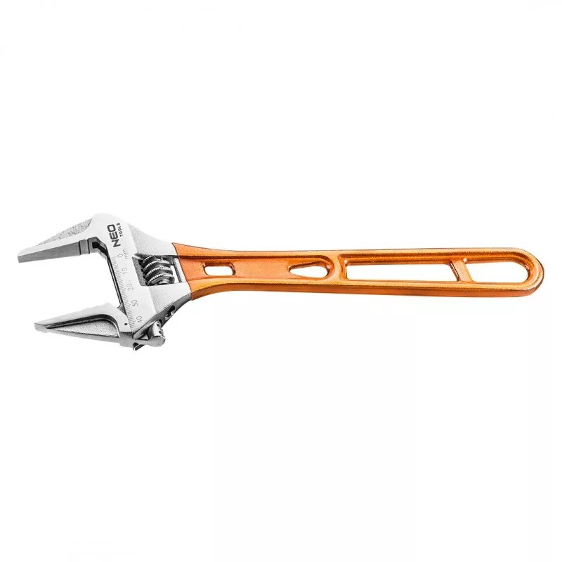 NEO állítható villáskulcs. Nagyszilárdságú króm-vanádium acélból kovácsolt 155 mm hosszú 0-28 mm-ig állítható kulcs. Megkülönböztetik hosszabbított, profilozott, széles terjedelemben szabályozható pofái és a kulcs fejének kis vastagsága, ami megkönnyíti a munkavégzést a nehezen hozzáférhető helyeken. A kulcs a csavarozott elemek védelmi rendszerével rendelkezik - az erő nem tevődik át közvetlenül a csavar vagy az anyacsavar szélére. A fogantyú speciális kialakítása révén a kulcs 30%-kal könnyebb a hagyományos állítható kulcsnál. A csúszásgátló bevonatú markolat garantálja a biztos fogást és biztosítja a biztonságos munkavégzést.