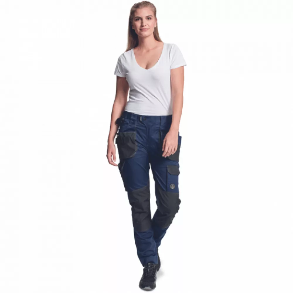 Dinamikus vonalvezetésű, modern szabású női nadrág, rugalmas, innovatív TRIFIBETEX® anyagból. Alacsony, gumírozott derékkal készül, láb- és üleprészen tartós, tripla varrásokkal. Praktikus kialakítás: megerősített térdrész térdvédőtartó zsebbel, tágas, multifunkcionális első zsebek szerszámtartó pánttal, 2 hátsó zseb Oxford erősítéssel, a combon telefontartó zseb tépőzáras zsebfedővel, külön zsebek vonalzónak, késnek, kalapácsnak, egyedi repülőzseb, D-gyűrű, és szerszámtartó hurok a derékpánton. A nadrág szára meghosszabbítható a tökéletes illeszkedés érdekében. A munkaruha színeivel harmonizáló fényvisszavető elemekkel egészítettük ki.