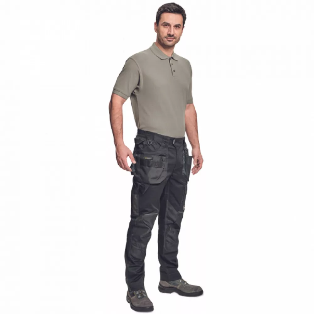 Alacsony, gumírozott derékkal készül, láb- és üleprészen tartós, tripla varrásokkal. Praktikus kialakítás: megerősített térdrész térdvédőtartó zsebbel, tágas, multifunkcionális első zsebek szerszámtartó pánttal, 2 hátsó zseb Oxford erősítéssel, a combon telefontartó zseb tépőzáras zsebfedővel, külön zsebek vonalzónak, késnek, kalapácsnak, egyedi repülőzseb, D-gyűrű, és szerszámtartó hurok a derékpánton.