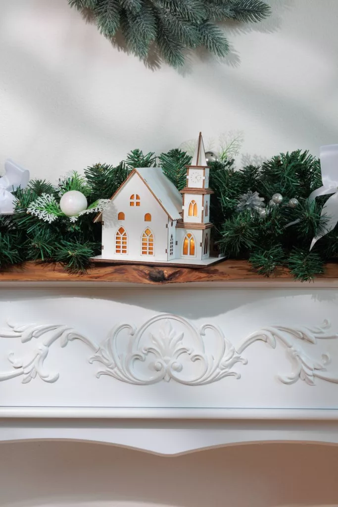 A természetes fából készült, templom alakú, elegáns karácsonyi dekoráció kellemes, meleg fénnyel fogja feldobni a belső teret. Belsejében 6× LED (meleg fehér) található, amelyek lágyan világítanak az ablakokon keresztül, és hangulatos ünnepi hangulatot teremtenek a polcon, a komódon és az ablakpárkányon.