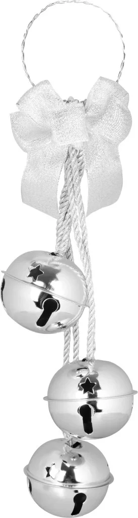 Elegáns karácsonyi dekoráció, ezüst színű csengők, ünnepi bájt és finom ragyogást kölcsönöznek otthonodnak. Három fémcsengő, díszes zsinóron lógva és masnival kiegészítve, harmonikus és ízléses kiegészítőt alkotnak, amely lágy csilingeléssel fogadja a vendégeket.
