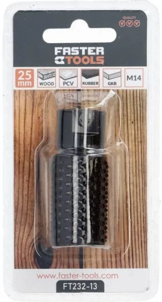 A FASTER FT232-13 egy speciális fafúró és ráspoly (marófúró), amelyet faanyagok megmunkálására terveztek. Ez a szerszám lehetővé teszi, hogy ne csak furatokat készítsen, hanem a furat oldalirányú tágításával vagy alakításával (ráspolyozással) egyedi formákat hozzon létre.