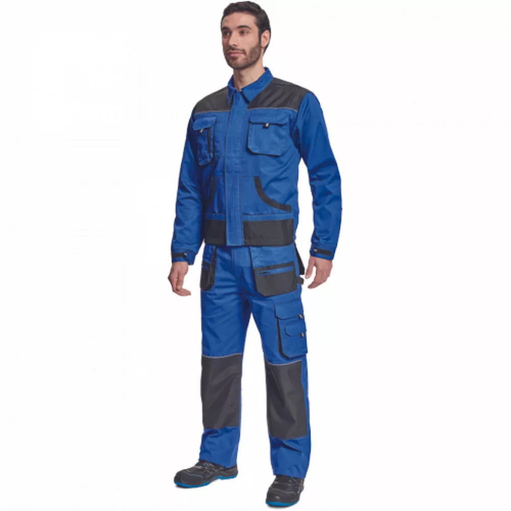 Férfi munkakabát; cipzáras kivitelben, tépőzáras hajtókával; 2 tépőzáras mellzseb, 2 multifunkcionális oldalzseb; OXFORD poliészter erősítés könyökrészeken és a vállakon; 100% pamut, 235g/m2