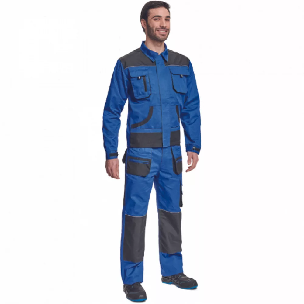 Férfi munkakabát; cipzáras kivitelben, tépőzáras hajtókával; 2 tépőzáras mellzseb, 2 multifunkcionális oldalzseb; OXFORD poliészter erősítés könyökrészeken és a vállakon; 100% pamut, 235g/m2