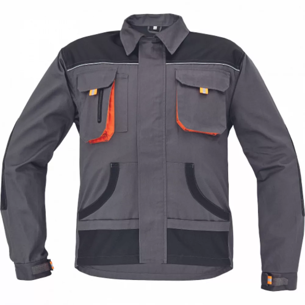 Férfi munkakabát; cipzáras kivitelben, tépőzáras hajtókával; 2 tépőzáras mellzseb, 2 multifunkcionális oldalzseb; OXFORD poliészter erősítés könyökrészeken és a vállakon; 100% pamut, 235g/m2