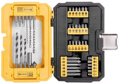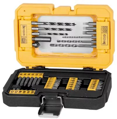 Praktikus, tokban elhelyezett fúró- és bitkészlet.