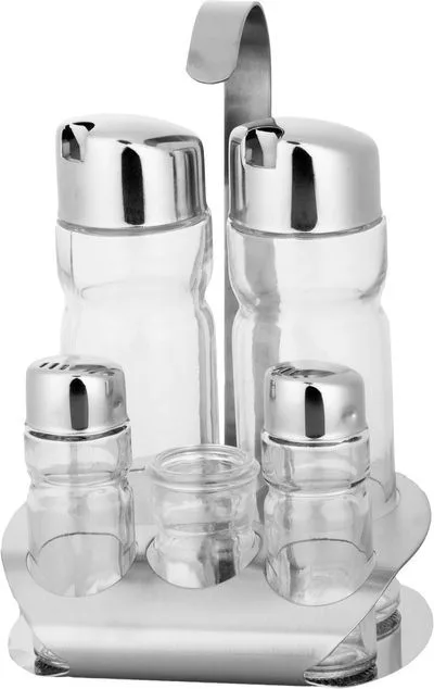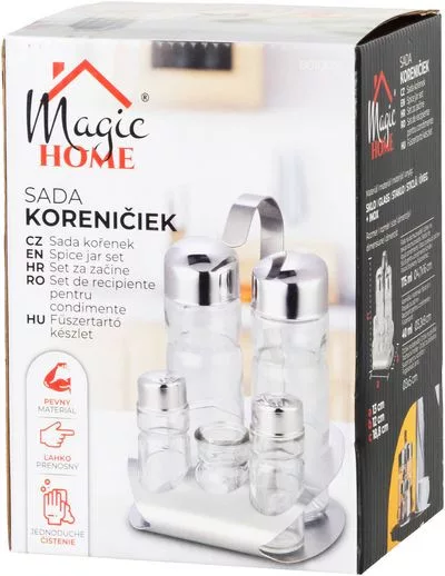 A MagicHome fűszertartó szett tökéletes megoldás a fűszerek és ételízesítők rendezett és stílusos tárolására. A készlet egy elegáns rozsdamentes acél állványt és praktikus üvegtartókat tartalmaz, amelyek ötvözik a funkcionalitást a modern dizájnnal.