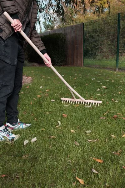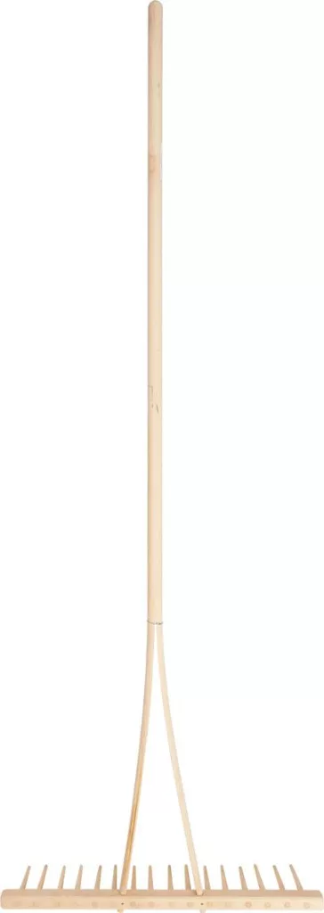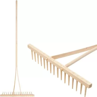 A gereblye teljesen fából készült, könnyű, így jól kezelhető, amikor a leveleket és a lehullott gyümölcsöket távolítja el a gyepről.