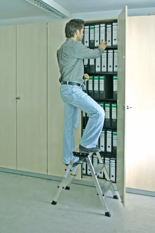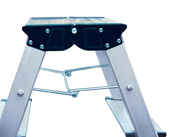 - Kétoldalas, összecsukható alumínium lépcsők rugós kerekekkel és 200 x 350 mm-es platformmal.