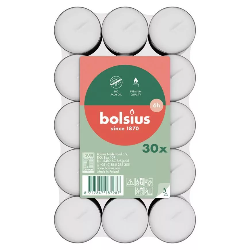 Gyertya Bolsius, teamécses, 6 óra, fehér, csomag 30 db