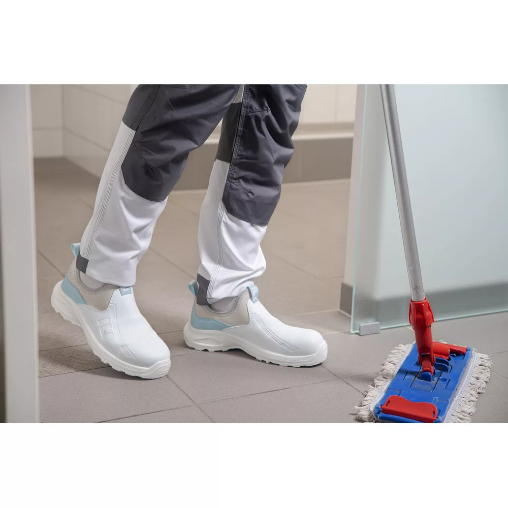 A fehér HYGOSAFE biztonsági lábbeliket fokozott higiéniai, tisztasági és kényelemi igényekkel bíró környezetekbe tervezték. A kettős sűrűségű PU/PU külső talp az NHP habszivacs sarokbetéttel érezhetően puhább lépést és fokozott kényelmet biztosít egész napos viselés közben. A víztaszító, mikroszálas PU műbőr és a neoprén egyedülálló kombinációja tartós, könnyen karbantartható felsőrészt hoz létre, amely tartósan megőrzi a rugalmasságot és a kényelmet. A szénszálakkal megerősített biztonsági lábujjvédő alacsony tömeget eredményez a védelem feláldozása nélkül. Az antibakteriális hálós bélés elősegíti a szellőzést és a kellemes belső klímát.