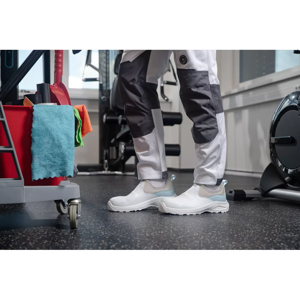 A fehér HYGOSAFE biztonsági lábbeliket fokozott higiéniai, tisztasági és kényelemi igényekkel bíró környezetekbe tervezték. A kettős sűrűségű PU/PU külső talp az NHP habszivacs sarokbetéttel érezhetően puhább lépést és fokozott kényelmet biztosít egész napos viselés közben. A víztaszító, mikroszálas PU műbőr és a neoprén egyedülálló kombinációja tartós, könnyen karbantartható felsőrészt hoz létre, amely tartósan megőrzi a rugalmasságot és a kényelmet. A szénszálakkal megerősített biztonsági lábujjvédő alacsony tömeget eredményez a védelem feláldozása nélkül. Az antibakteriális hálós bélés elősegíti a szellőzést és a kellemes belső klímát.