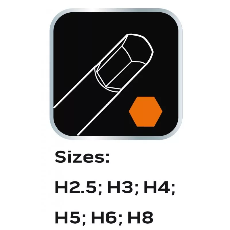A NEO márkájú műhelyszekrényekhez kínált HEX típusú csavarkulcsok átfogó készlete. A szerszámok kiváló minőségű S2 acélból és kétkomponensű fogantyúból készülnek, ami nagyobb használati kényelmet biztosít. Ezeket szerelőműhelyekben és javítóműhelyekben való használatra szánják. A készlet nyolc kulcsot tartalmaz a következő méretekben: H2, H2.5, H3, H4, H5, H6, H8, H10. A profilozott betétnek köszönhetően a szerszámok tökéletes rendben tarthatók. A NEO márkájú csavarkulcsokat a legnagyobb használati kényelemre tervezték.