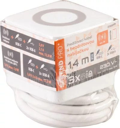 A fehér színű praktikus hosszabbítókábel akár 1,4 méteres áramellátást biztosít. Irodákban és otthonokban egyaránt használható. A három aljzatnak köszönhetően egyszerre több eszköz csatlakoztatását teszi lehetővé. Ennek a hosszabbító kockának praktikus funkciója a vezeték nélküli töltés és töltés 2x USB A és USB C 5V kimeneten keresztül, így könnyedén töltheti mobiltelefonját vagy más elektronikus eszközét adapter nélkül. A vezeték nélküli töltés csak olyan eszközökkel kompatibilis, amelyek támogatják a 110-205 kHz-es vezeték nélküli töltést (WPT).