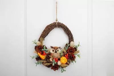 A MagicHome koszorú az őszi hónapokban sem hiányozhat a belső dekorációból. Ez egy ízléses koszorú bagollyal. Mérete 35x34x10 cm.