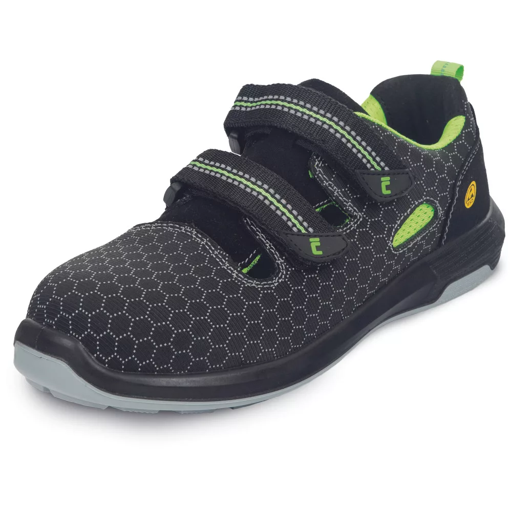 Fémmentes ESD biztonsági szandál üvegszálas kompozit lábujjvédővel és "S" típusú többrétegű PES átszúrás ellen védő köztalppal.