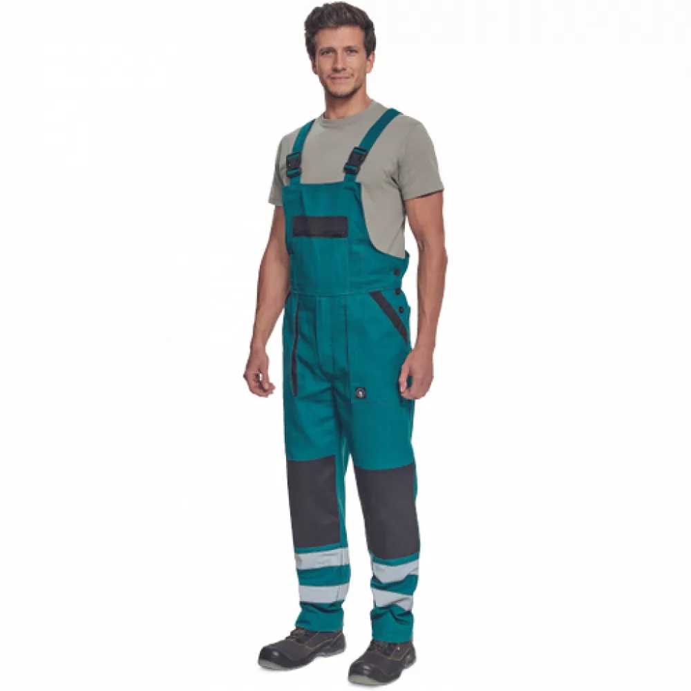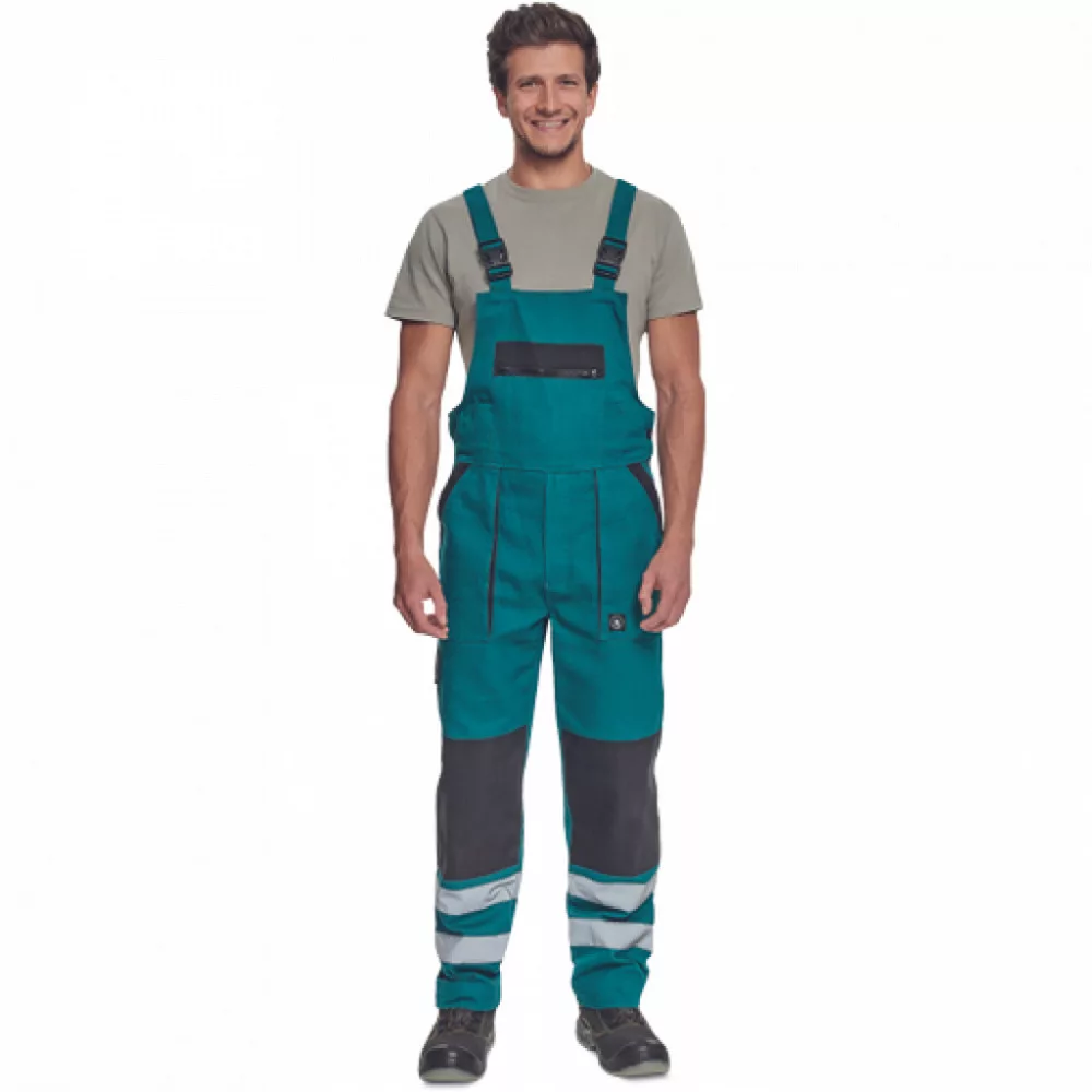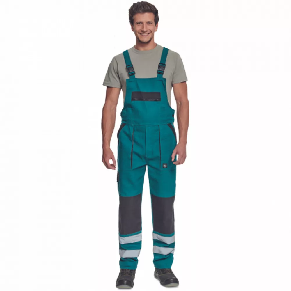 férfi mellesnadrág rugalmas derékkal, széles pántokkal, műanyag csatokkal; 2 első zseb, 1 oldalzseb, 1 nagy mellzseb, 2 hátsó zseb;