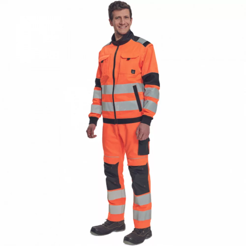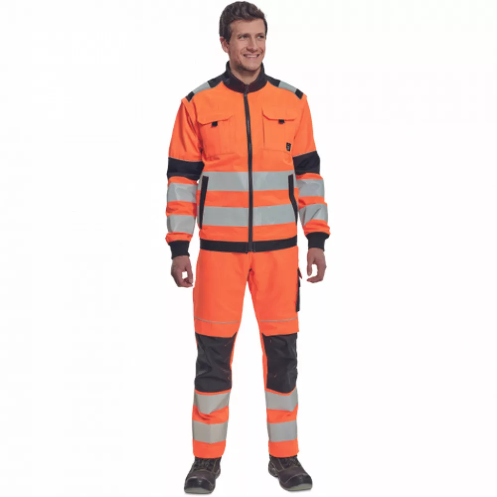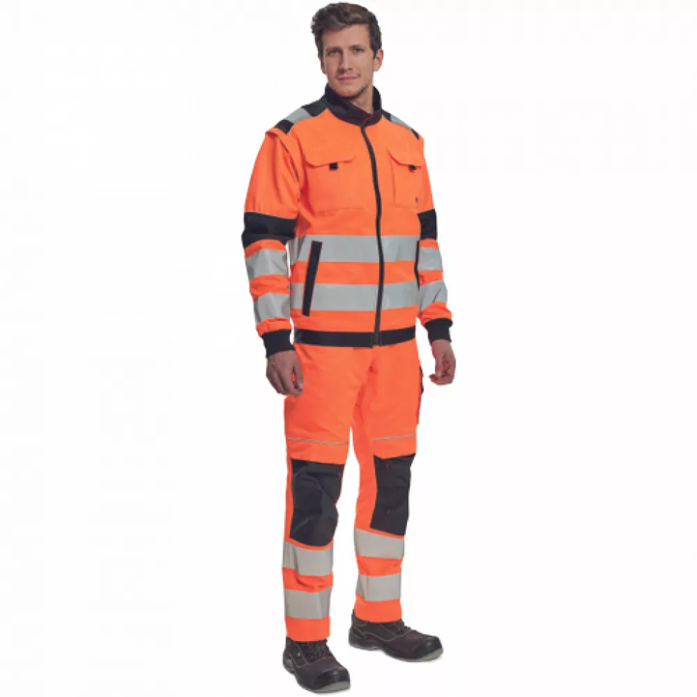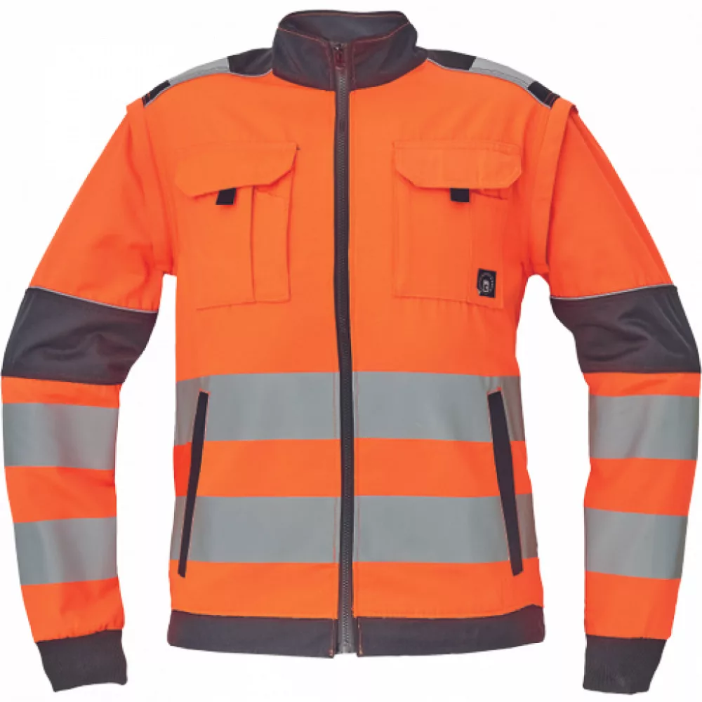 férfi HI-VIS cipzáras munkakabát levehető újakkal; 2 első zseb, 2 mellzseb; Oxford 600D megerősítés a váll és könyök részeken; 7 cm-es nyomtatott fényvisszavető csík az ujjak és a hátsó derékrész körül; 2 kisebb fényvisszavető csík a vállakon, fényvisszavető szegés; rugalmas mandzsetta és alsó derékszegély