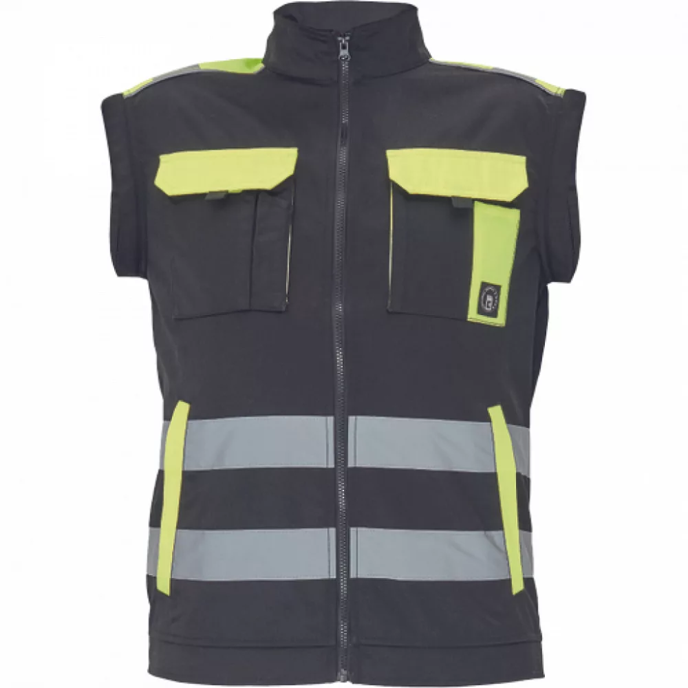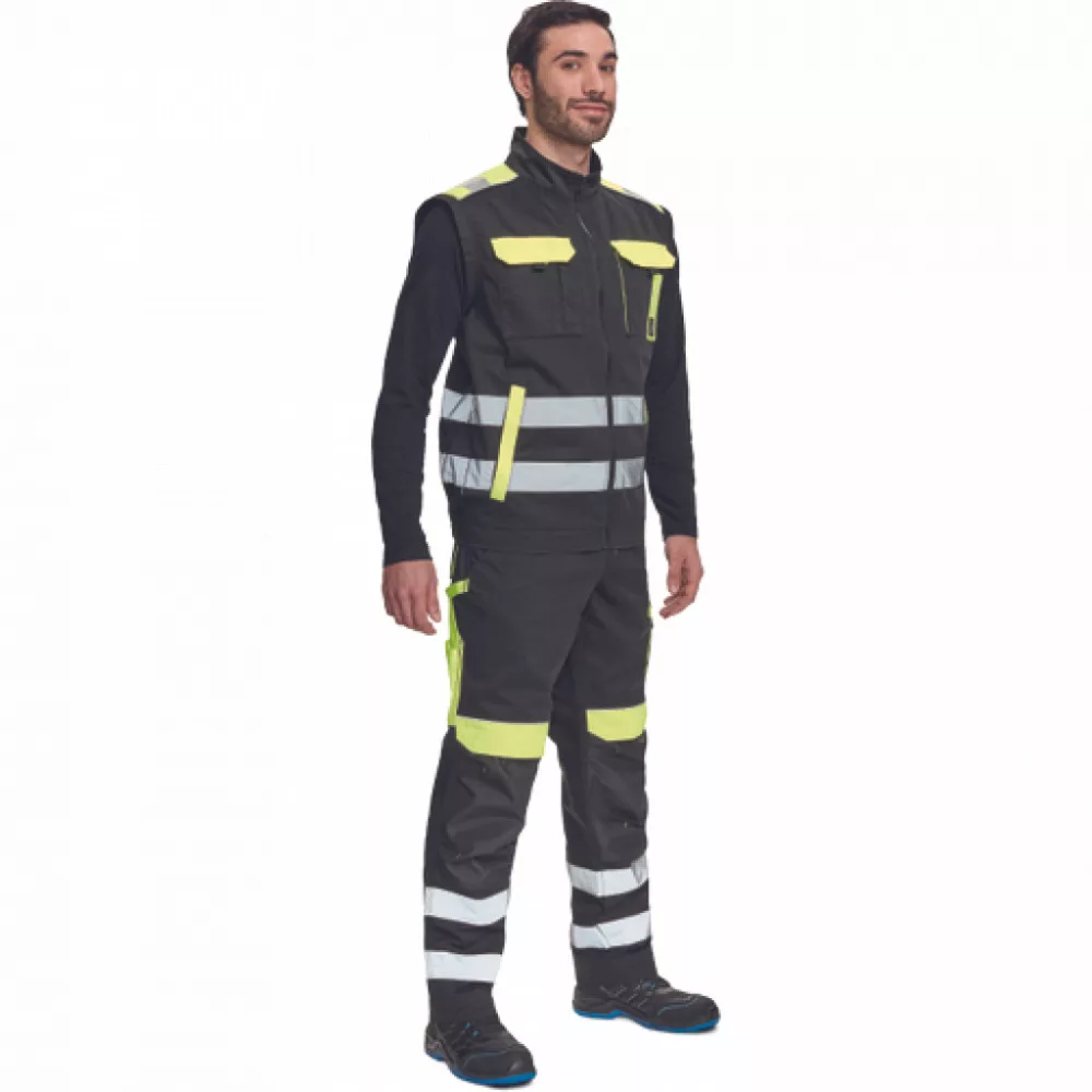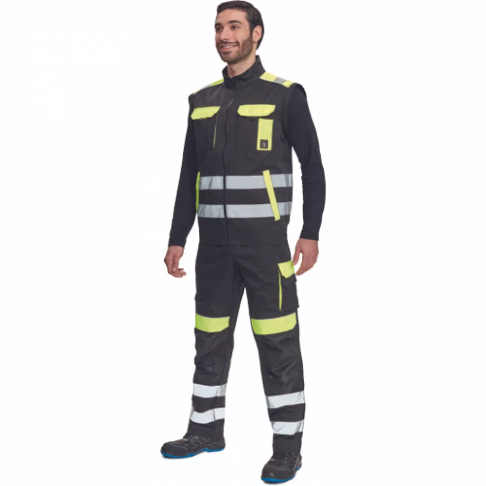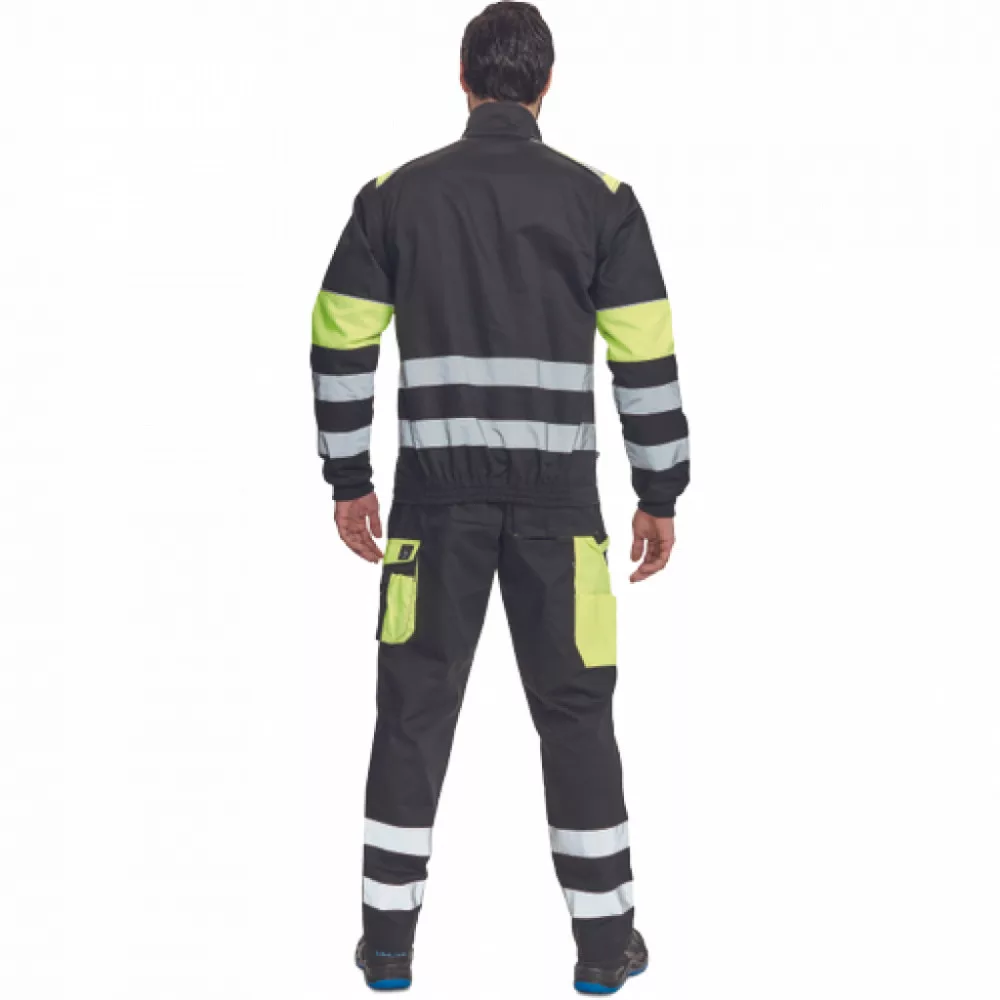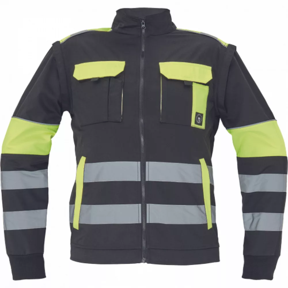 cipzáras férfi munkakabát, levehető ujjakkal 2 oldalzsebbel, 2 mellzsebbel készül, a a váll- és a könyökrészen megerősítő rátétekkel rugalmas mandzsetta és alsó szegély derékrészen, az ujjakon és a vállakon rávarrt fényvisszavető csíkokkal van ellátva