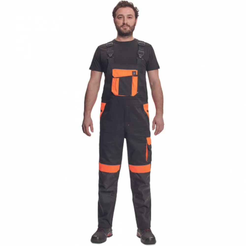 férfi mellesnadrág rugalmas derékkal, széles pántokkal, műanyag csatokkal; 2 első zseb, 1 oldalzseb, 1 nagy mellzseb, 2 hátsó zseb;