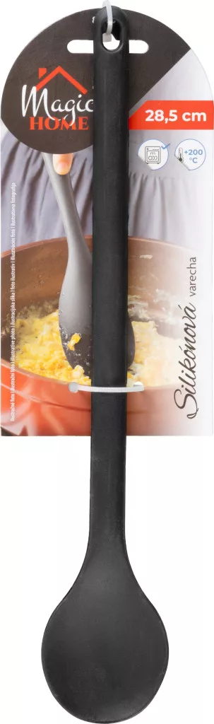A MagicHome szilikon főzőkanál 28,5 cm hosszúsággal ideális segítő minden konyhában. Kiváló minőségű szilikonból készült, amely +200 °C-ig ellenáll, így magas hőmérsékleten is alkalmas a főzésre. Mivel szilikonból készült, kíméletes az edényekhez, és nem karcolja meg az érzékeny felületeket, például a tapadásmentes serpenyőket vagy edényeket.