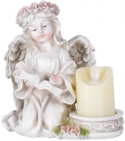 MagicHome dekoráció, angyal könyvvel és gyertyával, LED, poligyanta, sírra, 17,5 x 14,5 x 17,5 cm