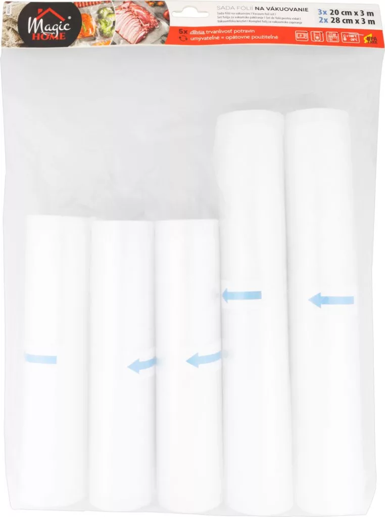 - Praktikus készlet: Tartalmaz 3 db 20x300 cm-es és 2 db 28x300 cm-es tekercset, amely rugalmasságot biztosít a különböző méretű élelmiszerek csomagolásához.