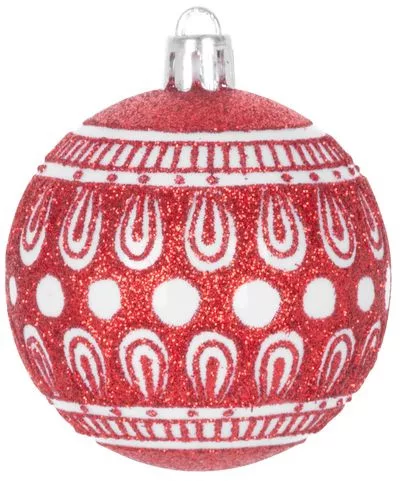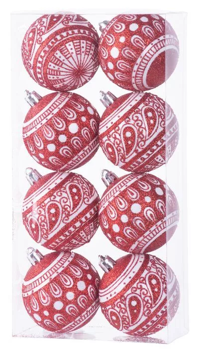 A karácsonyfa díszkészlet a karácsonyfa ünnepi díszítésére szolgál. 8 db fehér díszített, egyenként 6 cm átmérőjű gömbből áll. A gömbök színe piros. Műanyagból készült.