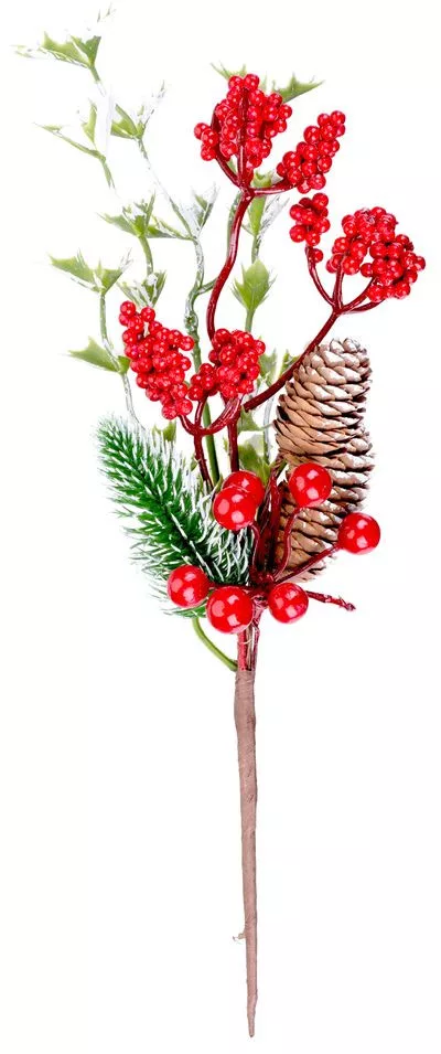 MagicHome karácsonyi ág, bogyókkal és tobozokkal, piros, havas, 27 cm