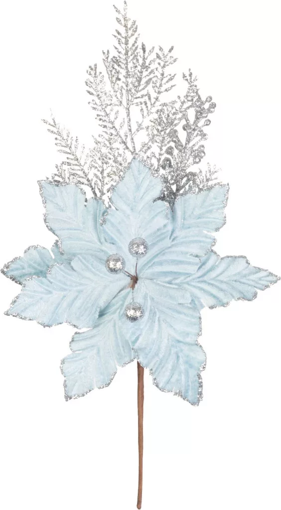 MagicHome karácsonyfaág, mikulásvirággal, kék/ezüst, 27 cm