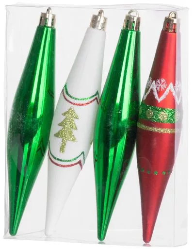A karácsonyfa díszkészlet a karácsonyfa ünnepi díszítésére szolgál. 4 db 3 x 15 cm méretű karácsonyi díszből áll. A dísz színe piros-zöld, dekorációval. Műanyagból készült.
