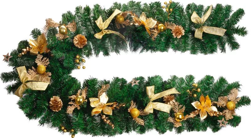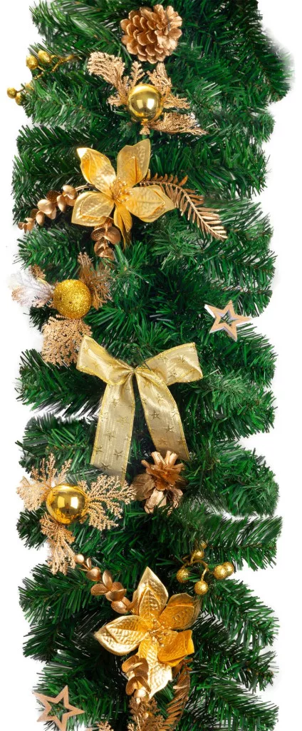A MagicHome karácsonyi dekoráció egy csipetnyi eleganciát és luxust hoz otthonába. Ez a 200 cm hosszú , aranyszínű füzér karácsonyi virágokkal, masnikkal, fenyőtobozokkal és gömbökkel gazdagon díszített, tökéletes ünnepi hangulatot teremt.