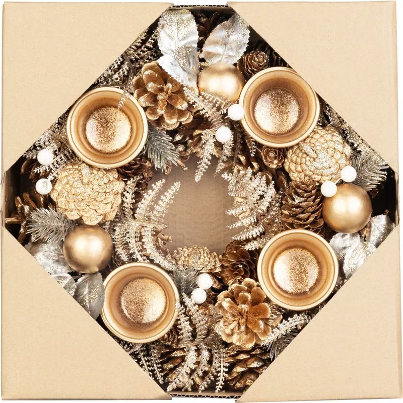 Kényeztesse magát a tökéletes karácsonyi hangulattal az elegáns MagicHome adventi koszorúval. A fényűző arany színben készült, természetes fenyőtobozokkal, dekoratív gömbökkel és levelekkel díszített koszorú stílusos csillogást kölcsönöz az ünnepi időszaknak. A négy gyertyatartó tökéletes felosztást biztosít az adventi gyertyák meggyújtásához a karácsony előtti négy hétben.