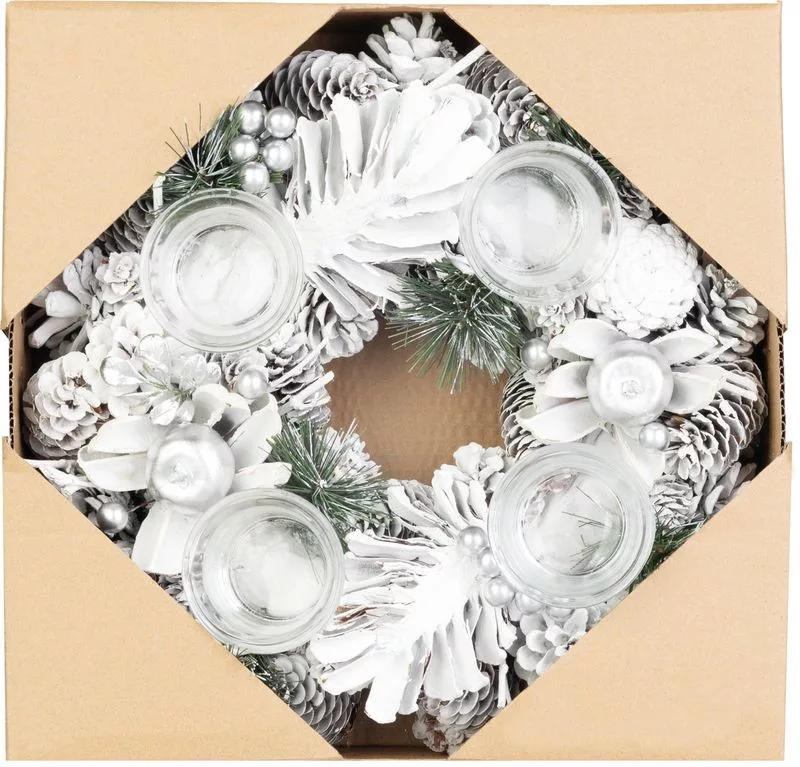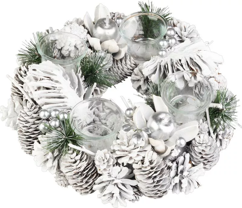 A MagicHome karácsonyi adventi koszorú lágy fehér színben tökéletes kiegészítője az ünnepi dekorációnak. A koszorút fenyőtobozok, virágok és apró díszek díszítik, természetes anyagokkal kombinálva, hogy elegáns és friss megjelenést biztosítson.