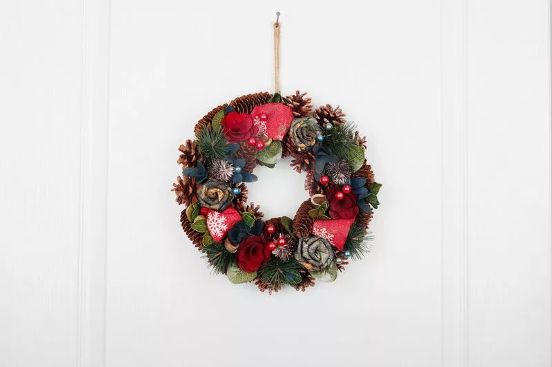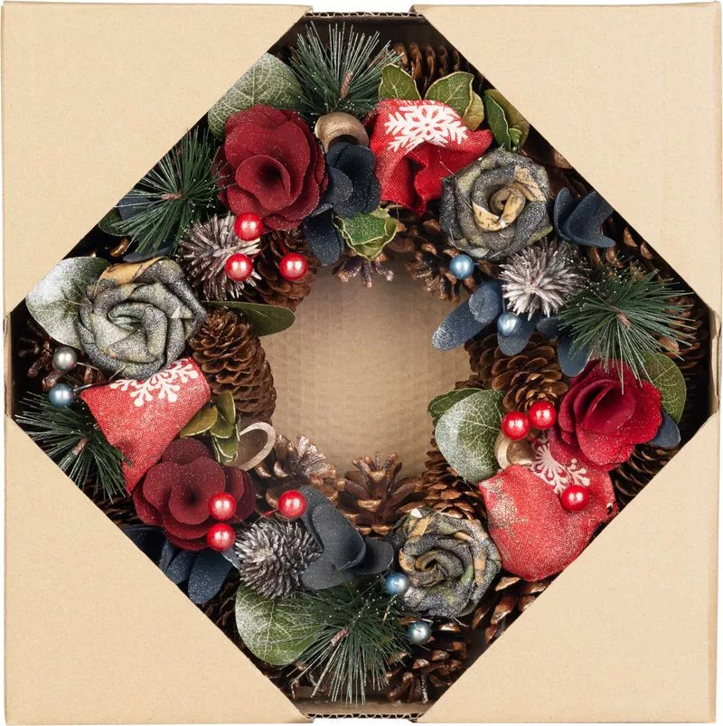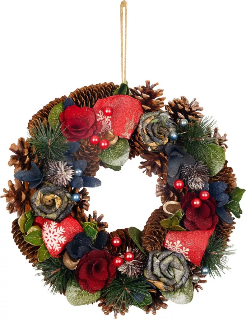 A MagicHome karácsonyi koszorú kialakítása eleganciát és ünnepi hangulatot varázsol otthonába. A koszorút természetes fenyőtobozok, dekoratív virágok és kék-piros árnyalatú díszgömbök díszítik, modern, mégis meleg megjelenést kölcsönözve.