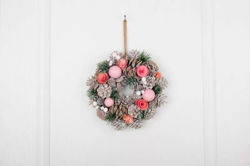 Dobja fel karácsonyi dekorációját ezzel az egyedi lógó koszorúval, amely a lágy rózsaszín és a melegítő narancssárga árnyalatokat ötvözi a modern és játékos megjelenés érdekében.